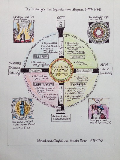 In der Mitte bewegen ‚Sapientia‘ (Weisheit), ‚Caritas‘ (Liebe) und ‚Viriditas‚ (Grünkraft) sozusagen als göttlicher Motor die Heilsgeschichte. – Oben (im Osten) ist ‚Gott‚ als Anfang und Ende der Geschichte dargestellt. – Mit der Schöpfung beginnt die Zeit des Paradieses, in der kosmische Harmonie herrscht. Es gibt noch keine Krankheiten und Fortpflanzung geschieht durch Teilung, noch ohne sexuellen Akt. Nach Gottes ‚Ewigem Ratschluss‘ ist die Jungfrau Maria ‚Mater Dei‘ – Gottesmutter von Beginn der Zeiten. – Mit dem ‚Sündenfall‚ kommen dann zugleich Krankheiten und Tod in die Welt. Nun beginnt die Zeit ‚Synagogas‘ in der Moses und die Propheten die Söhne und Töchter Evas leiten. – In der Mitte der Geschichte steht das Ereignis der Inkarnation, der Geburt des Gottessohnes. – Das Leben Christi von der Geburt bis zur Passion bildet dann, mit dem Heilswirken des Gottessohnes (auch mit seinen Wunderhelungen) auf der Erde die dritte Zeitperiode. – Mit dem Tod am Kreuz ist zugleich Heil verbunden. So sieht Hildegard in ihrer Vision von Christus und seiner Kirche (Tafel 33) nicht nur Christus am Kreuz, sondern die ‚Hochzeit auf dem Kalvarienberg‘, in dem ‚Ekklesia‘, die Braut Christi, als Priesterin an seinem Altar, dessen heilendes Blut in einem Kelch empfängt. Mit diesem ‚Heilmittel‘ aus dem ‚heiligen Gral‘ kann Ekklesia nun auch Heil und Heilung zu den Menschen bringen. – Diese vierte Zeit der Heilsgeschichte ist nun die Zeit Ekklesias, in der wir alle bis zum ‚Ende der Zeiten‘. In dieser ‚Zeit der Kirche‘ sind die Entwicklung der ‚Tugenden‘ und der ‚Synergie‘, der Zusammenarbeit von Gott und Menschen zum ‚Aufbau der Stadt Gottes‘ unsere Aufgabe.“ (Annette Esser, „Hildegards Heilkunde“, in: Pilgerbuch. Hildegard von Bingen Pilgerwanderweg. 3. aktualisierte und erweiterte Auflage, Verlag Matthias Ess, Bad Kreuznach 2026, S. 346-362)