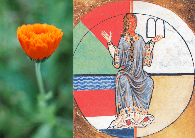 Du edelstes Grün, das seine Wurzeln in der Sonne hat, und das in heiterem hellem Glanz leuchtet, im Kreis, von keinem noch so ausgezeichneten irdischen Sinn zu begreifen. Du bist umfangen von der großen Umarmung der göttlichen Geheimnisse. Wie die Morgenröte strahlst du und glühst wie der Sonne Feuer. Du bist umfangen von der großen Umarmung der göttlichen Geheimnisse.